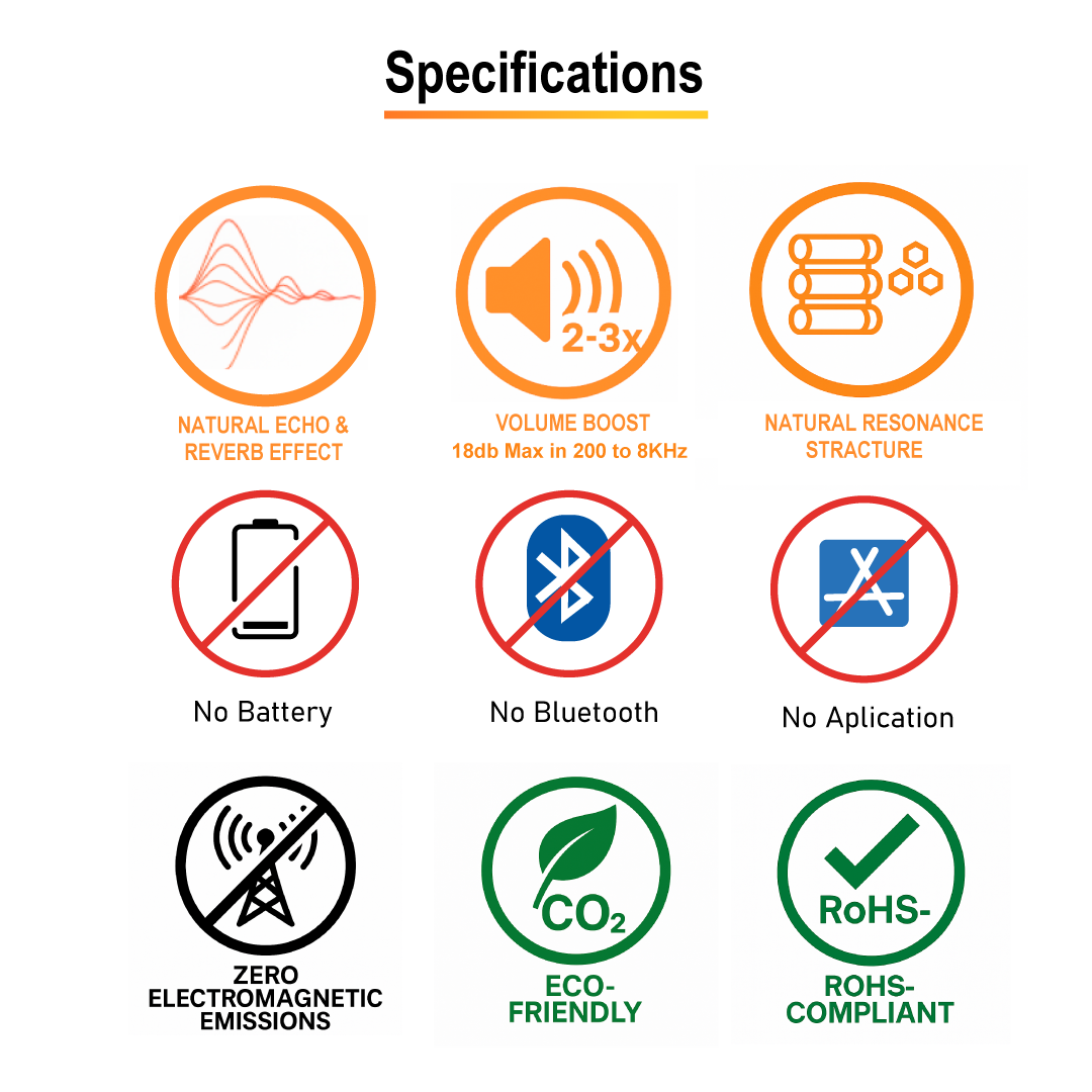 . It uses a resonance chamber and Fabry–Pérot–inspired tubes to bring speech bands (~200–8000 Hz) forward—no battery, no Bluetooth, no app.